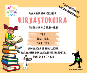 Koirille kannattaa varata etukäteen lukuaika, joka on 15 min/lukija. Tervetuloa!